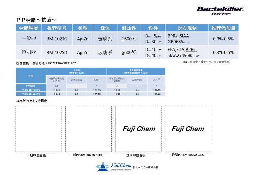 日本富士化工Bactekiller无机抗菌剂是全球知名品牌!4大优点:抗菌性能、透明性、耐变色性、安全性!符合日本SIAA、美国EPA、FDA、欧盟BPR等认证!我司备有各树脂型号的抗菌母粒,在注塑、吹
